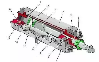 1、3-緩沖柱塞,2-活塞 ,4-缸筒 ,5-導向套,6-防塵圈,7-前端蓋,8-氣口,9-傳感器,10-活塞桿,11-耐磨環 ,12-密封圈,13-后端蓋 ,14-緩沖節流閥