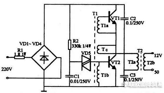 如圖所示。DAYKIN變壓器原理與開關(guān)電源工作原理相似,二極管vd1~vd4構(gòu)成整流橋把市電變成 直流電,由振蕩變壓器t1,三極管vt1、vt2組成的高頻振蕩電路,將脈動(dòng)直流變成高頻電流,然后由鐵氧體輸出變壓器t2對高頻高壓脈沖降壓,獲得所需 的電壓和功率。r1為限流電阻。電阻r2、電容c1和雙向觸發(fā)二極管vd5構(gòu)成啟動(dòng)觸發(fā)電路。 三極管vt1、vt2選用s13005,其b為 15~2 0倍。也可用c3093等buceo>=35ov的大功率三極管。觸發(fā)二極管vd5選用32v左右的db3或vr60。振蕩變壓器可自 制,用音頻線繞制在 h7 x 10 x 6的磁環(huán)上。tia、t1b繞3匝,tc繞1匝。鐵氧體輸出變壓器t2也需自制,磁心選用邊長27mm、寬 20mm、厚10mm的ei型鐵氧體。t2a用直徑為0.45mm高強(qiáng)度漆包線繞100匝,t2b用直徑為1.25mm高強(qiáng)度漆包線繞8匝。 二極管 vd1~vd4選用 in4007型,雙向觸發(fā)二極管選用db3型,電容c1~c3選用聚丙聚酯滌綸電容,耐壓250v。