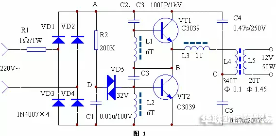 電路正常工作時(shí),A點(diǎn)工作電壓約為215V,B點(diǎn)約為108V,C點(diǎn)約為10V,D點(diǎn)約為25V。如果不振蕩,檢查VT1、VT2及L1、L2、L3的相位是否正常(交換L3的兩根接線即可)。改變L5的匝數(shù)可改變輸出電壓。