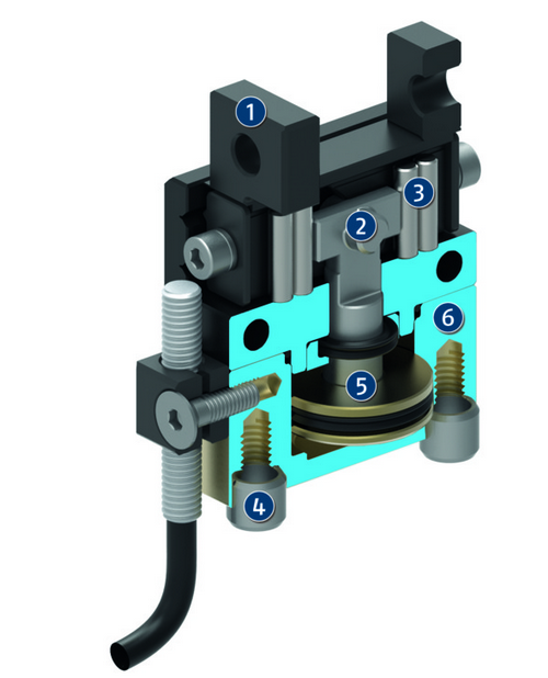 SCHUNK MPG 16產(chǎn)品結(jié)構(gòu)圖如下,活塞通過壓縮空氣上下移動。 側(cè)面鉤在活塞桿引導(dǎo)件的上端,在兩個(gè)基座爪的角槽中,從而將該運(yùn)動轉(zhuǎn)變成基指的同步打開或關(guān)閉。