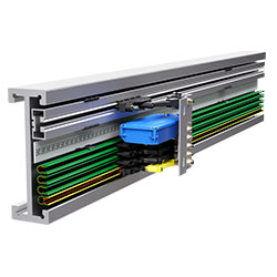在高架庫的應用里,巷道的空間通常很窄。貨物在很短的時間內通過堆垛機放置到貨架上儲存或從貨架上取下。為了滿足這些要求,VAHLE開發了排式滑觸線VKS 10。可以簡單地將VKS10輕松的安裝到一個支持背板中。